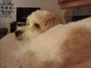 The boy who always lives with me and seems to be taking this the best is the little hairy one. He simply has attached himself to me, and if at all possible, is in my lap, including in the leather chair he’s not normally welcome to sit in… But even a dog can be thrown off by the odd vibes in the house. Tuesday when we got ready to go to the genetic counselor’s office, he started barking at me as I got dressed, and then tried to sneak into the car with us, like he knew that I was going to over do it. And when we got home, he said, “I told you so,” by staying away from the sidekick, when all he wanted to do is feed him.  We even dropped a piece of his food on the floor and he RAN AWAY FROM THE FOOD. Not normal dog behavior.
