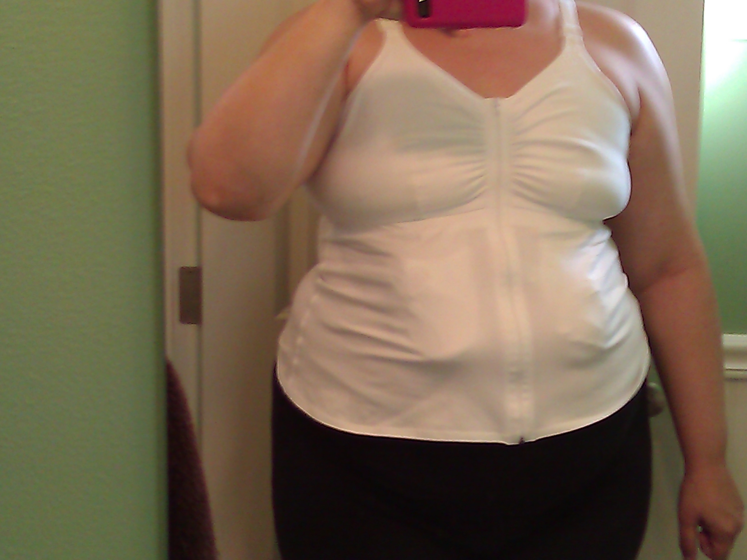 The bulges you see in the front (below the bulges that are my once and future boobs) are the pockets for the icky drain things. Was down to 35 on one side yesterday, but since I have to be at 30 for 2 days to get them out, I may end up waiting until Friday when I see plastics….